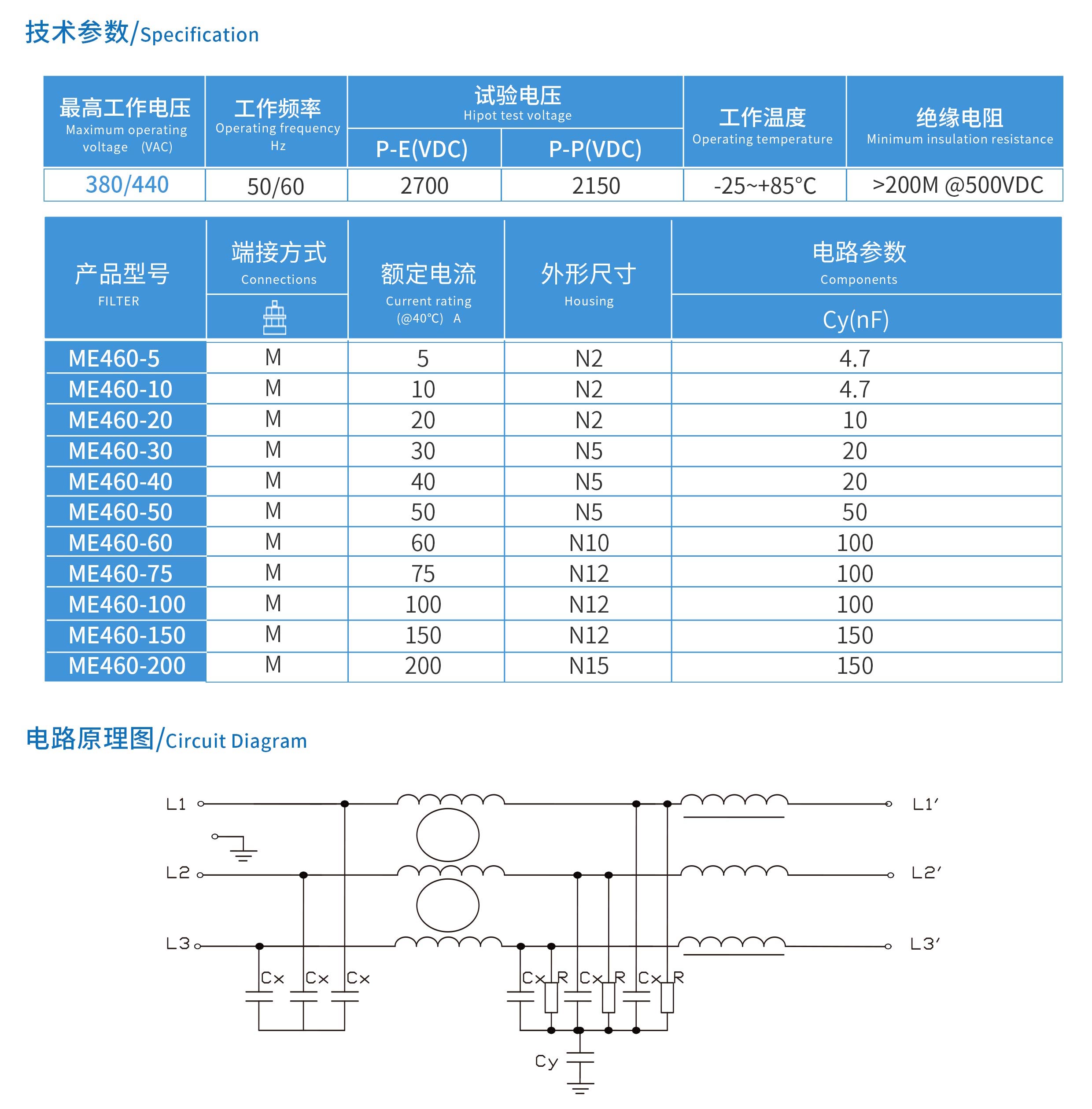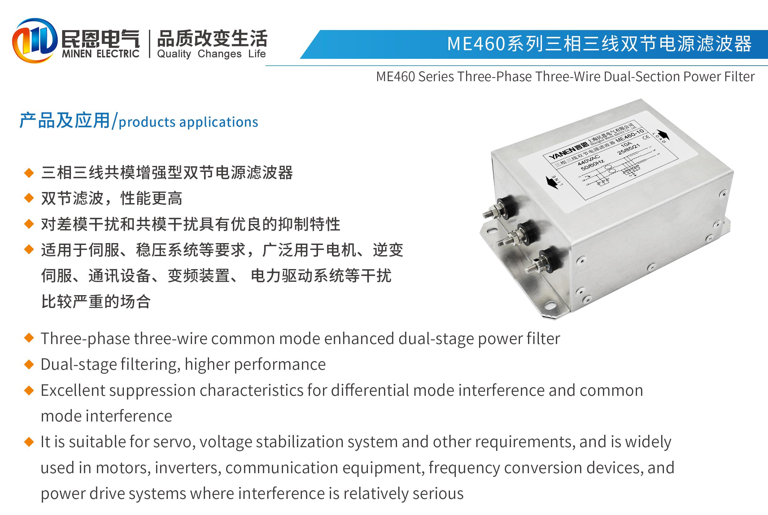 ME460系列雙節(jié)三相三線電源濾波器