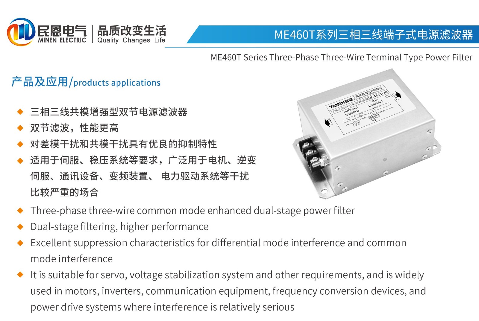 ME460T系列三相三線雙節(jié)端子式電源濾波器