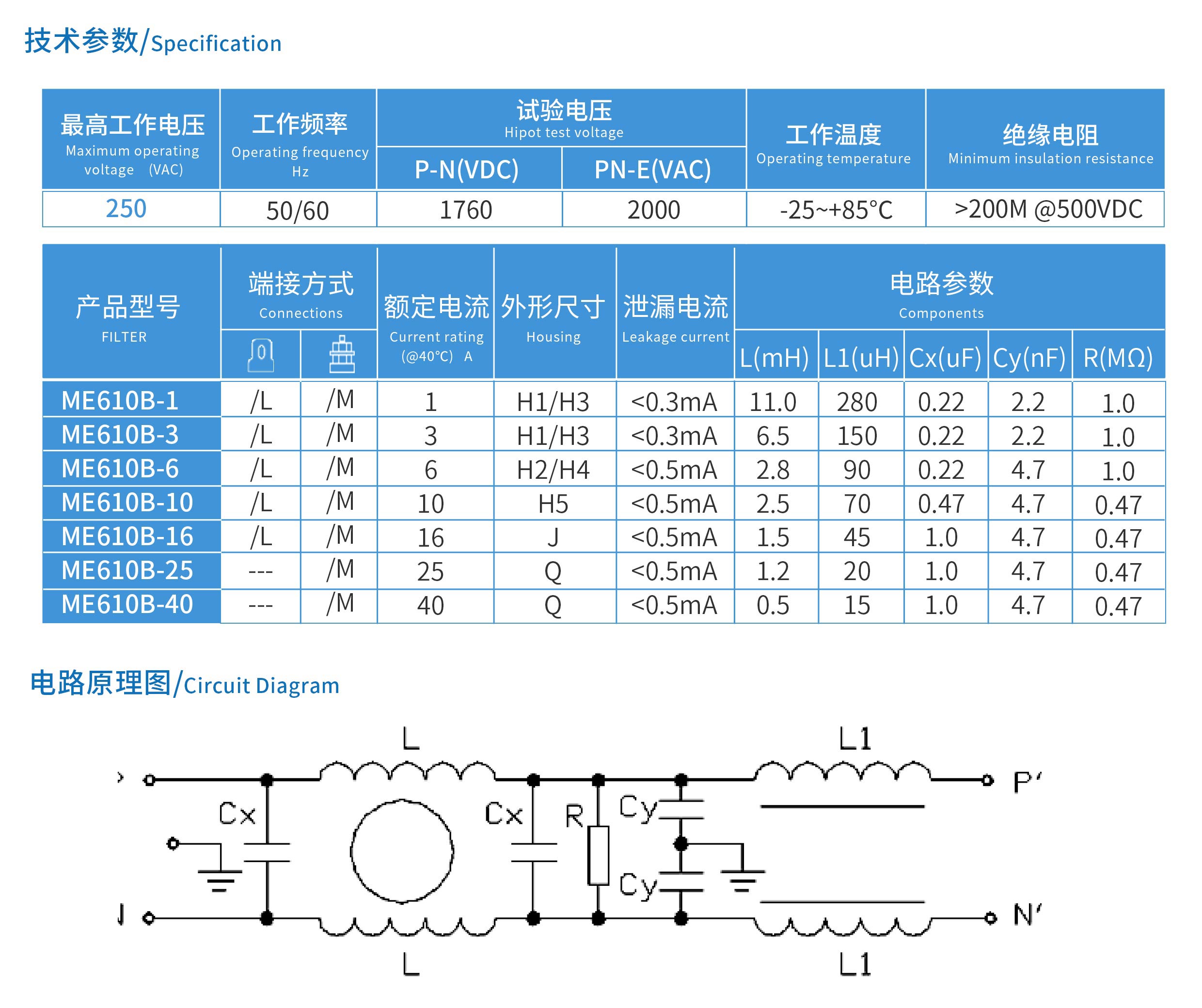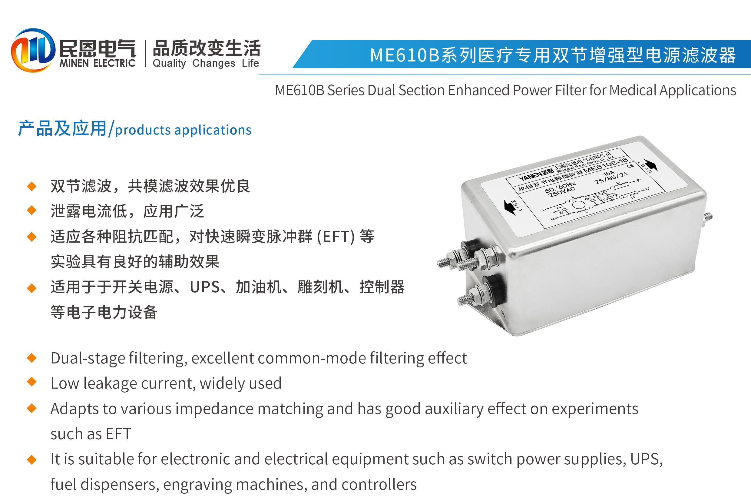 ME610B系列醫(yī)療專用雙節(jié)增強(qiáng)型電源濾波器