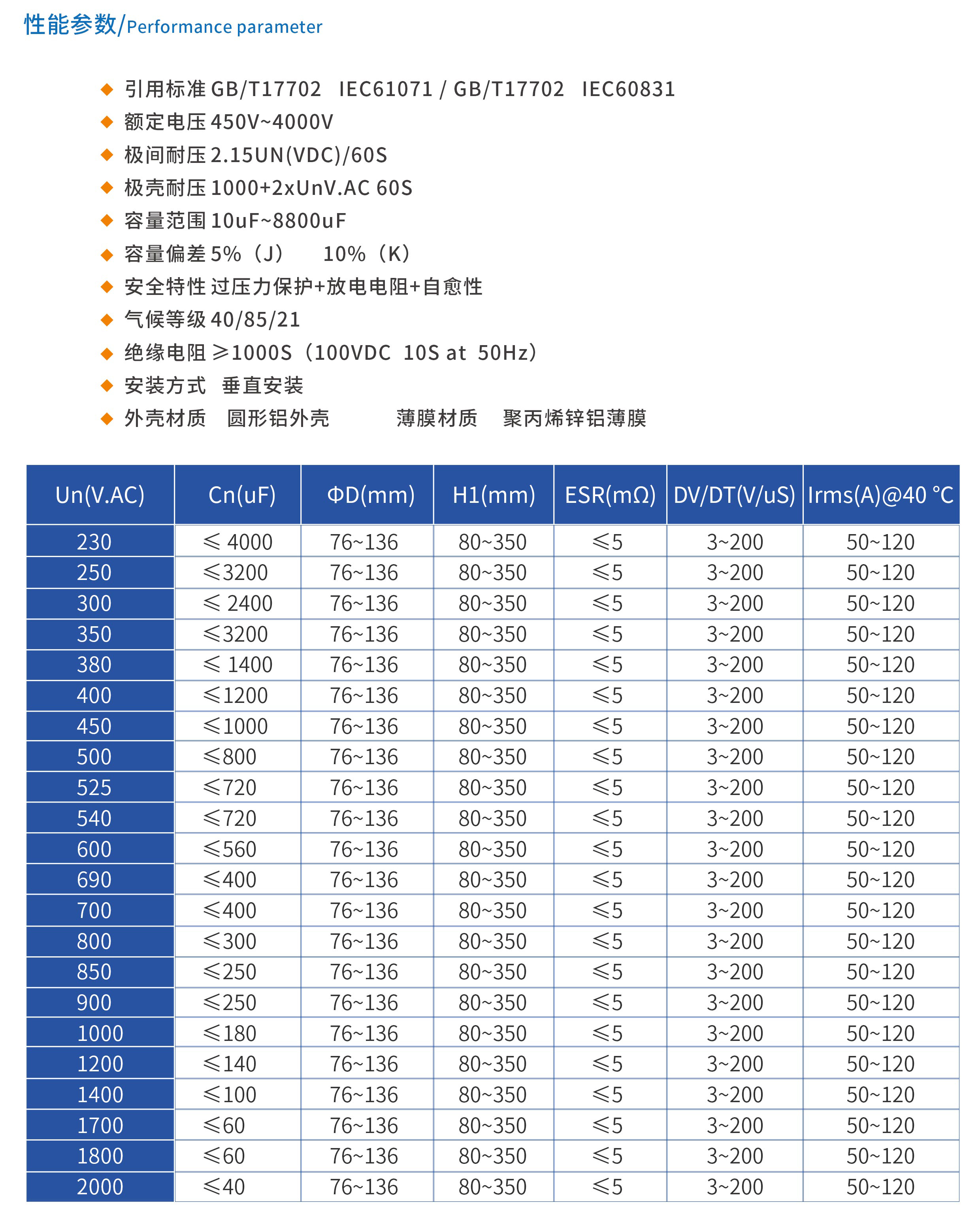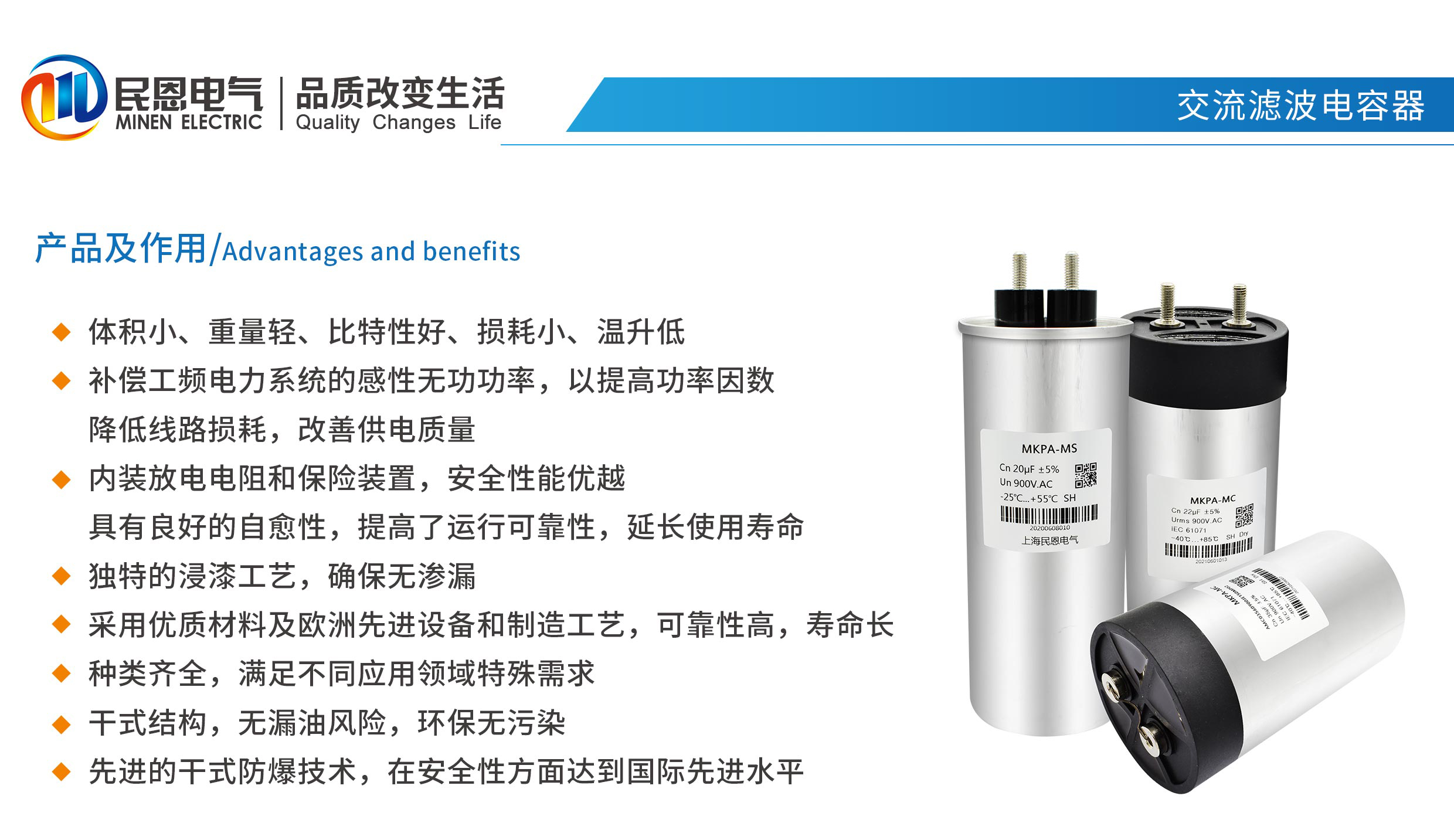 體積小、重量輕、比特性好、損耗小、溫升低,補償工頻電力系統(tǒng)的感性無功功率,以提高功率因數(shù)降低線路損耗,改善供電質量,內裝放電電阻和保險裝置,安全性能優(yōu)越具有良好的自愈性,提高了運行可靠性,延長使用壽命,獨特的浸漆工藝,確保無滲漏,采用優(yōu)質材料及歐洲先進設備和制造工藝,可靠性高,壽命長,種類齊全,滿足不同應用領域特殊需求,干式結構,無漏油風險,環(huán)保無污染,先進的干式防爆技術,在安全性方面達到國際先進水平