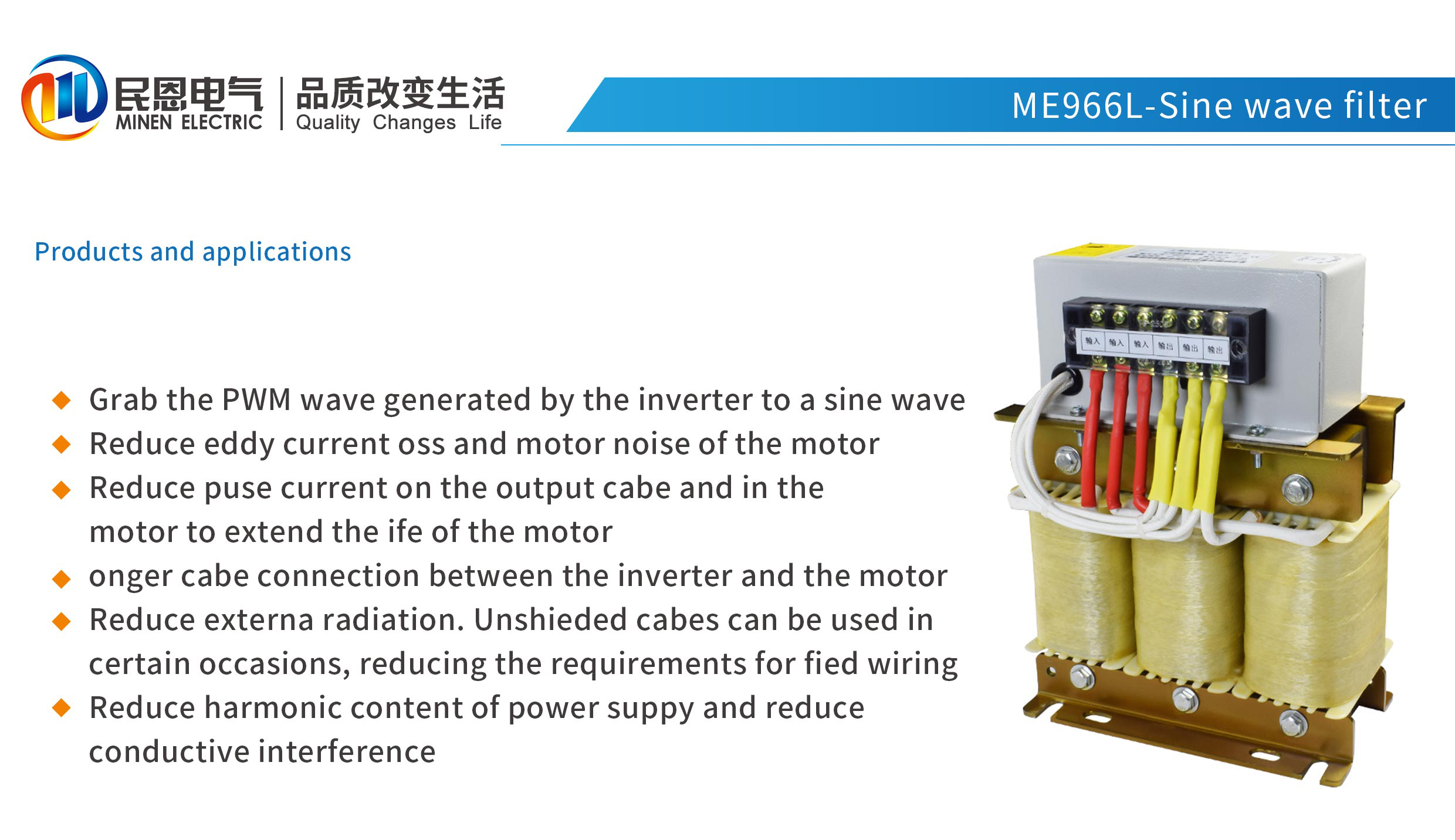 將變頻器產(chǎn)生的PWM波轉(zhuǎn)換為正弦波,降低電機的渦流損耗以及電機噪聲,減少輸出電纜上和電機中的脈沖電流,延長電機壽命,可在變頻器與電機間使用更長的電纜聯(lián)線,減小對外的輻射,在一定場合可以使用非屏蔽電纜降低了對現(xiàn)場布線的要求,降低電源諧波含量,減少傳導(dǎo)性干擾